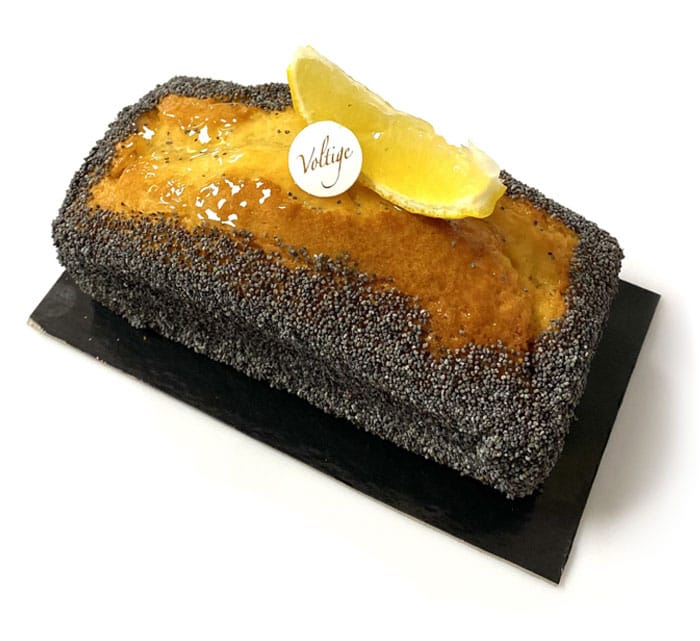 Cake citron garni d’un confit citron jaune, le tout enrobé d’une fine couche de graines de pavot.