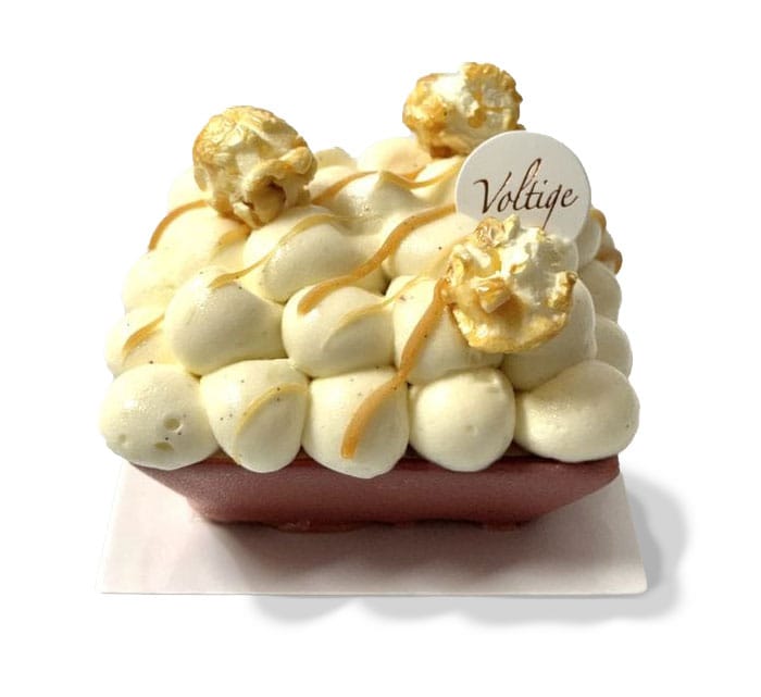 Composition : croustillant praliné maïs et popcorn caramélisé, biscuit moelleux aux amandes, mousse popcorn, caramel au beurre salé et popcorn caramélisé, ganache montée vanille bio de Madagascar et morceaux de popcon caramélisé