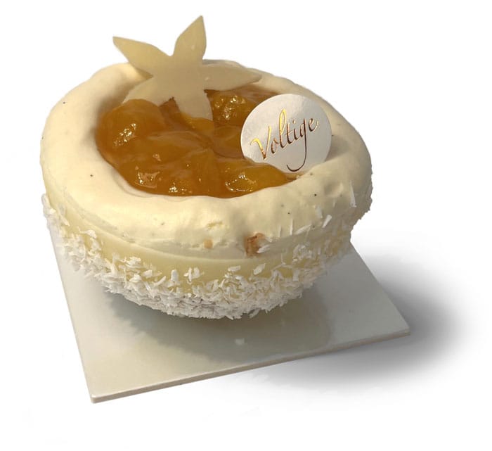 Streusel amandes coco, crémeux passion, poêlée de mangue, confit exotique & mousse noix de coco